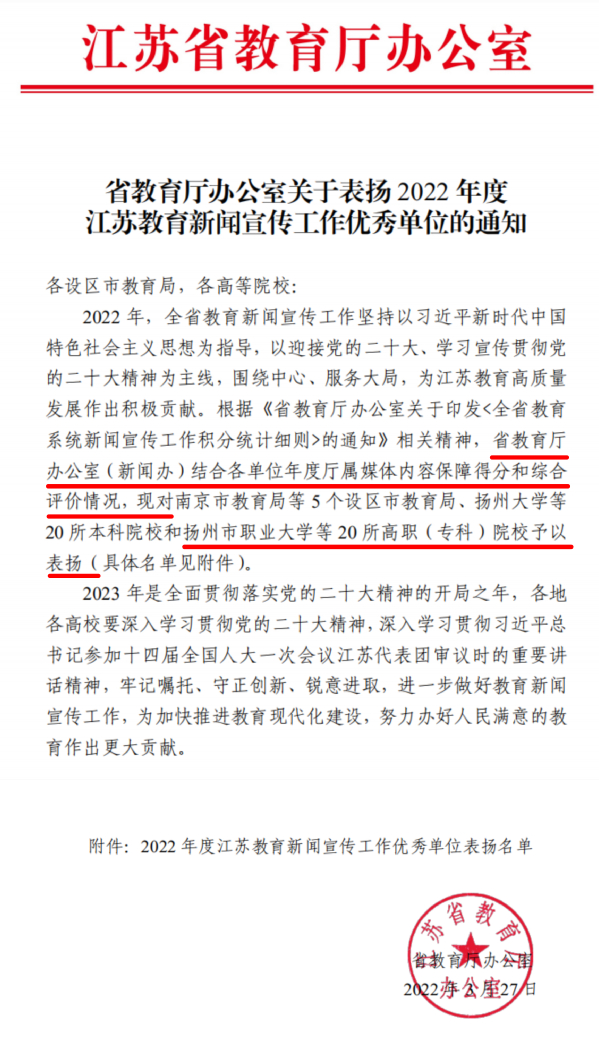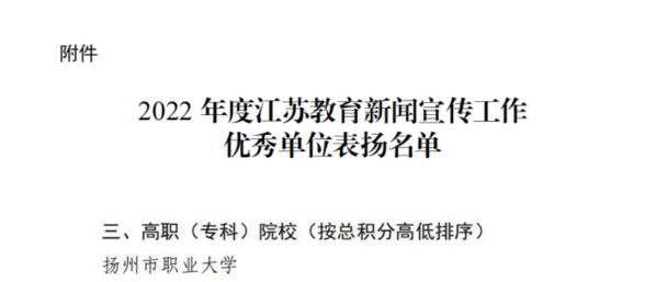 近日,江苏省教育厅办公室发布了《省教育厅办公室关于表扬2022年度江苏教育新闻宣传工作优秀单位的通知》,我校新闻宣传工作在学校党委的正确领导及各学院、部门齐心努力下,连续两年位列全省高职院校第一,连续三年获评江苏教育新闻宣传工作优秀单位。