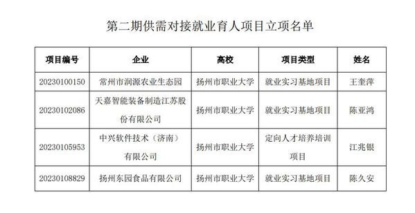经用人单位审核、专家评审、立项单位信息复核等多个环节批准,学校与常州市润源农业生态园、天嘉智能装备制造江苏股份有限公司、中兴软件技术(济南)有限公司、扬州东园有限公司4家用人单位达成定向人才培养、就业实习等合作项目。其中就业实习基地项目3个,定向人才培养培训项目1个。