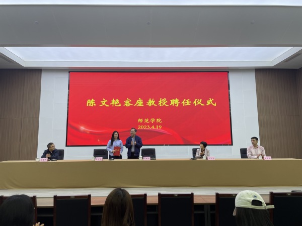 马顺圣向陈文艳颁发客座教授聘书。陈文艳为扬州市梅岭小学原校长、教育部“国培计划”中小学名校长领航班学员、扬州市有突出贡献的中青年专家、全国优秀教育工作者。