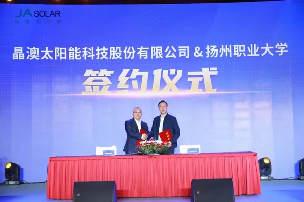 在领导和嘉宾们的见证下,林刚与晶澳科技高级副总裁孙广彬分别代表学校、企业共同签署了共建“智能光电与智造”产业学院协议。双方表示,建设好特色产业学院对于扎实推进产教融合、创新校企合作模式、深化合作内涵具有重大深远的意义。产业学院成立后,校企双方将充分发挥各自优势,构建校企合作人才培养的长效机制,发挥校企双主体育人的协同优势,打造“招生、培养、师资、资源、育人”五位一体、全程全面共育的培养模式,在人才培训、协同创新、技术成果交流等方面加强共享共通,为区域经济、社会和产业发展培养更多高素质技能人才,为现代光伏产业转型升级和国家新能源发展战略贡献更大的力量。