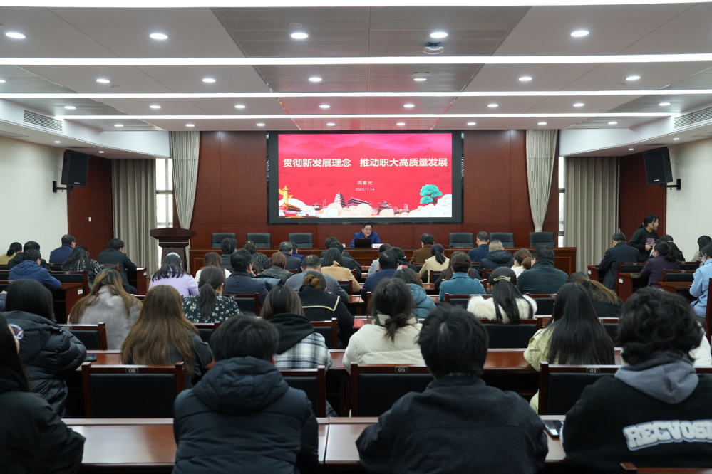 周春光强调,我校被江苏省列为中国特色高水平高职学校建设单位;被教育部纳入“十四五”本科层次职业学校建设项目;在“武书连”“校友会”等权威排行榜中位居全国同类院校前2.6%;这些都更加坚定了我们奋力推进学校高质量发展的信心。与此同时,我们也要清醒认识到学校还存在标志性成果不够显著,专业建设不够聚焦,人才培养不够规范等现实问题。周春光结合高校五大职能,从深化人才培养改革,推动人才培养高质量;丰富社会服务内涵,推动社会服务高质量;提升科学研究能力,推动科学研究高质量;扩大国际交流合作,推动国际交流高质量;以文化赋能人才培养;推动文化传承高质量等五个方面具体阐述了深入贯彻新思想、新理念,推动学校高质量发展具体路径。