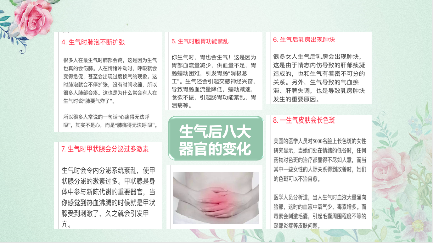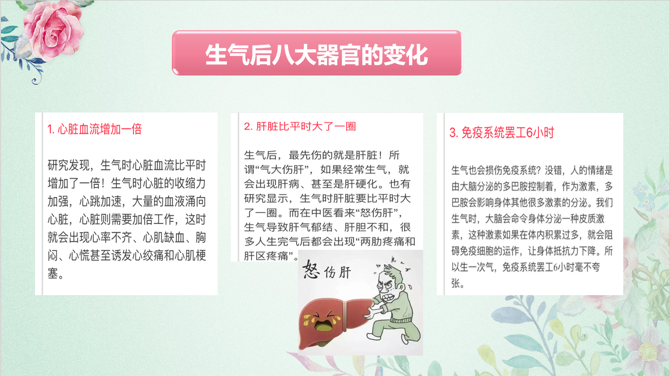 这些种种现象表明生气对身体的损害是巨大的,生气不仅会带来身体的变化,有时候可能会直接带走人们的生命,科学研究表明“生气水”在30分钟内直接杀死了小白鼠。在工作时生气也会直接影响工作情况,甚至是错失机遇。