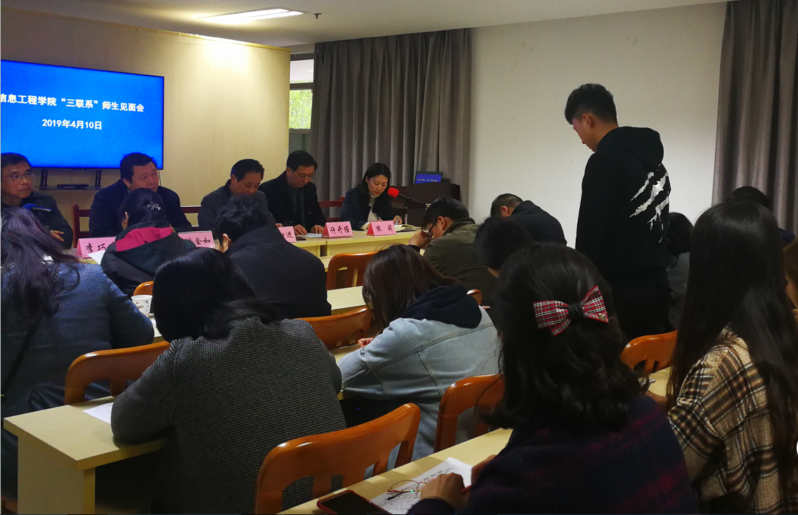 根据《中共教育部党组关于加强和改进高校领导干部深入基层联系学生工作的通知》精神(教党函〔2019〕34号),结合我校党委关于继续大力加强党员领导干部“三联系”工作的要求,信息工程学院党总支精心组织党政干部“三联系”师生见面会。4月10日下午,在校学生处“辅导员之家”,联系我院“班级、宿舍、学生”的校党委副书记、副校长许金如全程参与了见面会,并与所联系的班级班主任、室长代表以及学生代表亲切交流。学生处袁新进处长,张涛、徐秋生副处长以及国际交流合作处、审计处的三名副科级干部,学院党政领导班子成员李巧鸣、江兆银、许开维、张莉及所有二级机构负责人曹跃球、陈网风、洪伟、洪亮、顾家玉、卢扬、杨燕、张光桃、施俊、林治出席了见面会,与13个联系班级的班主任老师、宿舍室长及22名联系学生面对面交流。