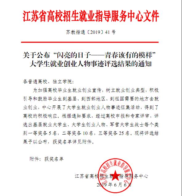 为加强高校毕业生就业创业宣传,树立就业创业典型,积极引导和鼓励毕业生到基层、到西部地区、到祖国需要的地方去就业创业,江苏省高校betway 官网 指导服务中心开展了第二届“闪亮的日子——青春该有的模样”大学生就业创业人物事迹评选活动。信息工程学院高度重视此次活动,积极联系毕业生撰写事迹材料,并在校betway 官网 处指导下反复修改润色,最终获得喜人的成绩:计算机网络技术专业1401班毕业生卢静荣获“基层就业大学生”二等奖,计算机应用专业1401班毕业生夏长玲荣获“军营大学生战士”三等奖。
