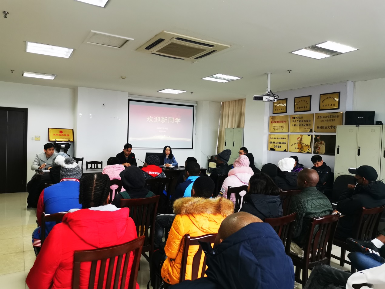 11月25日上午,南非留学生开课典礼在信息工程学院会议室举行。学院领导、班主任、任课教师与20名留学生出席了活动。学院院长江兆银首先作开课动员讲话,他代表扬州职业大学信息工程学院1200名师生欢迎远道而来的新同学,希望同学们能充分利用宝贵的交流机会,遵守校纪校规,认真学习专业知识,并能够学习、了解中国文化,成为中非文化交流的使者。动员会后,班主任老师带领留学生们参观了信息工程学院专业实训室,熟悉上课环境,并与任课教师进行了面对面的交流。