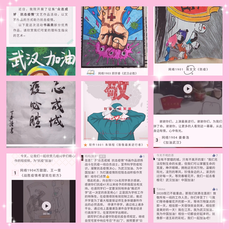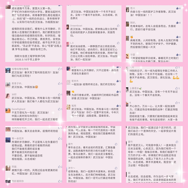 本次活动得到了全院学生的积极响应,共收到各类文艺作品103件,部分优秀作品通过学院微信公众号“扬职大奕奕信息”进行了四期专题推送,同学们反响热烈,积极留言点赞,向抗“疫”一线的英雄们致敬,为武汉加油,为中国加油!纷纷表示,疫情防控每个人都是主体,一定会听从学校的管理和安排,好好“宅”家,做好安全防护、调整好心态,合理安排学习和生活,不提前返校,做疫情防控最好的守卫者。