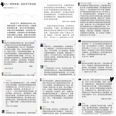 信息学院的同学们通过多种渠道进行全程收看,对本次“思政大课”反响强烈,在班级QQ群开展了热烈的交流和讨论,并积极撰写“疫情防控思政大课”听课感悟。对部分同学的听课感悟,学院微信公众号以《同上一堂思政课,信息学子有话说》进行了专稿推送,该条推送再一次得到了广大同学的积极关注并引发共鸣,截止目前有68名同学进行了署名留言。