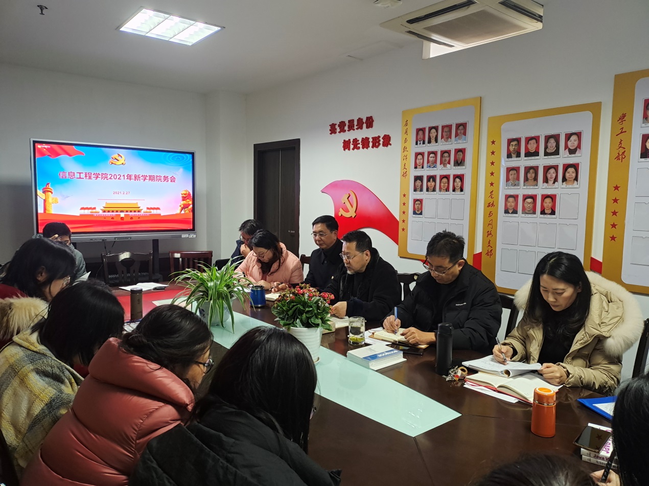 2月27日下午,信息工程学院领导班子召集院学工办、团委、教科办、综合办、各系部、实训室等部门负责人及相关骨干教师在图书馆710会议室召开了新学期第一次院务会议,会议由院长江兆银主持。