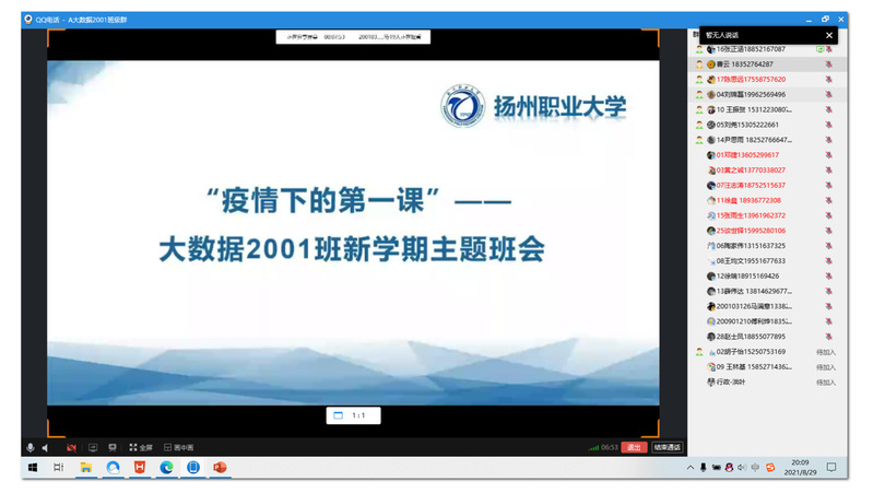 “同学们,今年的暑假,德尔塔病毒的突然造访,一定给大家留下了终身难忘的记忆。目前疫情仍未结束,新学期的第一课,就让我们相聚云端,共同回顾这段刻骨铭心的抗疫经历,从中汲取信心、勇气和力量,以最佳状态迎接大二年级的到来。”正在主持直播课堂的是扬州职业大学信息工程学院大数据2001班班主任曹云老师。2021年8月28日,信息工程学院760名学生顺利完成了线上报到,30日起他们将迎来为期五周的线上教学。29日晚,在学院党总支的统一部署下,2019级、2020级18个班级同时开启了“云端第一课”。