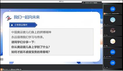 “青春逢盛世,奋斗正当时!2022年的北京冬奥会,我们都是见证者,见证了青春的绚烂之花绽放在冰雪赛场上;我们也是参与者,‘带动中国3亿人参与冰雪运动’的北京冬奥初衷已经实现,中国体育事业正在不断向好发展。”学院党总支负责人说,“而在中华民族伟大复兴的强国路上,青年一代更要成为奉献者,发挥自己的点滴之力,汇聚成建设国家的浩荡伟力。让我们在习总书记‘做新时代追梦者’的感召下,在冰雪健儿们的榜样激励下,以舍我其谁的高度责任感,用‘奋斗’和‘拼搏’作为青春底色,把个人的理想追求融入实现中华民族复兴的伟大事业之中,知重负重、勇毅前行,在实现第二个百年奋斗目标新征程中再接再厉,攀上新的高峰!”