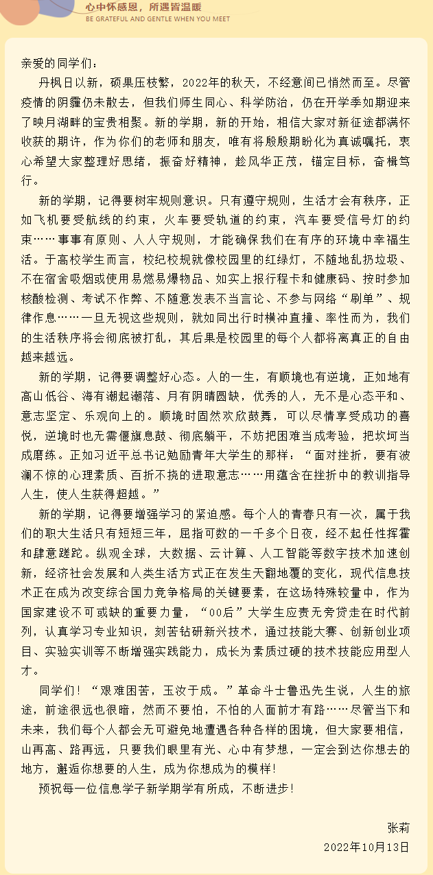 信息工程学院党总支书记张莉给学生的“微书信”