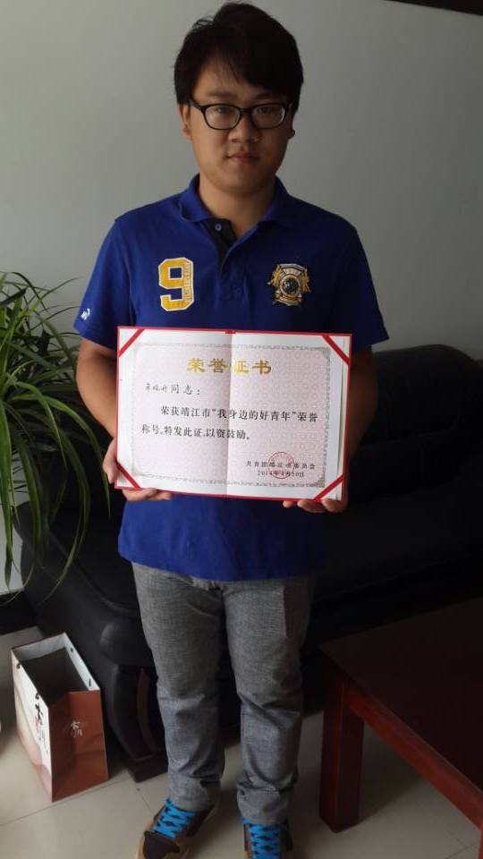 4月30日,我院朱晓丹同学在2013年荣获大学生年度人物提名奖后。又在2014年靖江市团市委组织的靖江市第二届“我身边的青春榜样”评选活动中,荣获“我身边的好青年”荣誉称号。希望我校青年们以实际行动贡献青春正能量