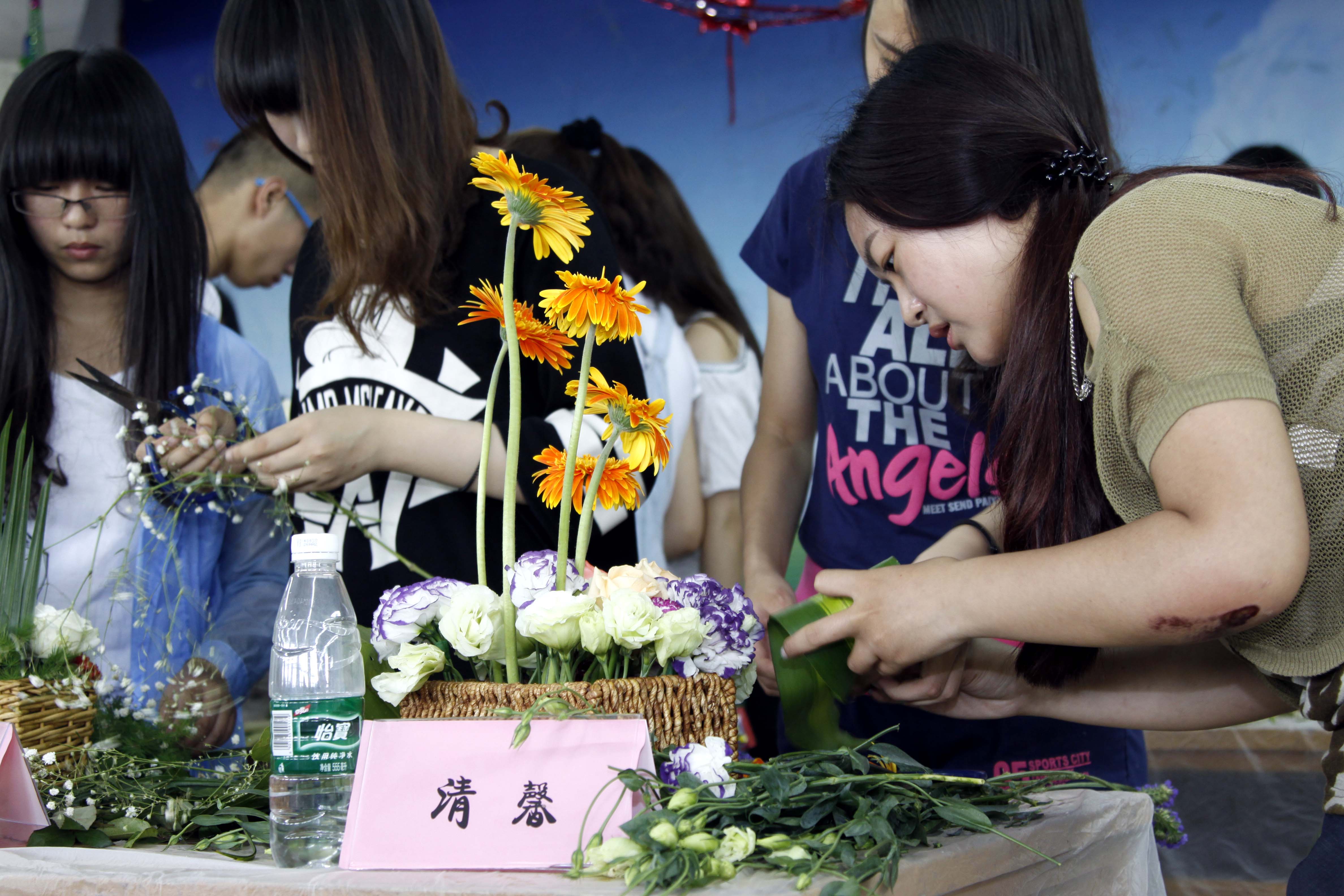 6月11日下午,园林园艺学院举办首届“插花比赛”。参加比赛的总共有24组选手,他们每个都手艺精湛。整个现场比赛进行的十分激烈,每组成员都有每组的独特创意,比如作品“琉璃月”,整个造型是一个下弦月的造型,选用花材多而不杂,为这美丽的“琉璃月”镶上璀璨的宝石;作品“扬帆远行”,整个造型中,用散尾葵精心修剪成帆,用剑兰来做旗帜,用玫瑰和康乃馨让美丽的船帆锦上添花。