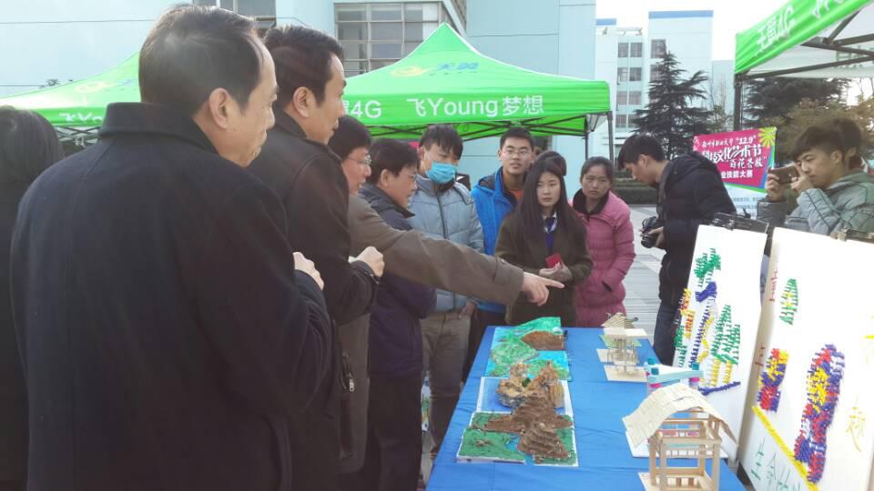 为了使学校“12.9”科技文化艺术节活动更加丰富多彩,园林园艺学院党总支、关工委、团委以加强学生专业动手能力、激发学生创造力、想象力为出发点,分别举办了园林景观设计、景观摸型设计、板钉设计大赛,学院学生兴趣浓厚,积极参加。图为学校领导观看比赛现场的学生作品。
