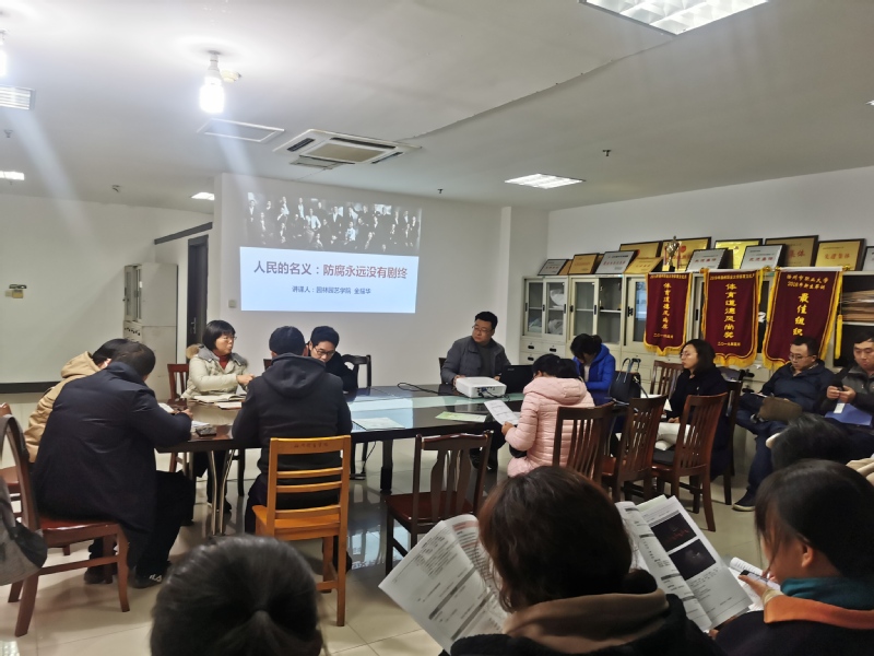 学院副书记金耀华以防腐热播剧《人民的名义》为切入点,讲述防腐永远没有剧终。他从《人民的名义》剧情解读,热播分析等几方面,分析了几个领域的干部腐败分子从人生观、家庭观、权力观等腐化蜕变的原因,经过分析比较该片正反两阵营人物性格及故事路线,告诉我们一个党员干部若不注重学习提高、不加强党性锻炼,心智就会紊乱、思想就会抛锚、行动就会迷失正确的方向。