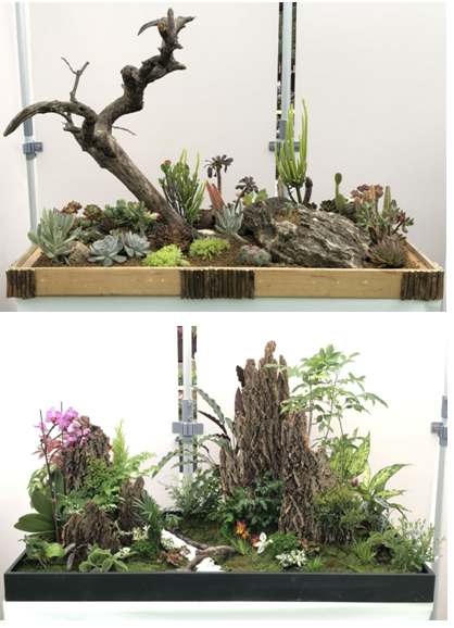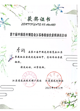 李丽老师以自己独具匠心的设计创作了名为“生命的力量”的多肉组合盆栽、“山涧明霁色”的花卉植物组合盆栽2个作品,获得评委一致好评,喜获铜奖;赵迎春老师创作了名为“新芽”和“争春”2个作品,荣获优秀奖。