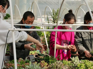 前期园林园艺学院的志愿者们做好了充足的准备,在园艺师傅们的指导下需要将多肉移栽到美观的器皿中,志愿者们用手托住盆口,把盆倒过来,然后再把多肉植物倒出来了,将一些死根、烂根用剪刀把根修短一点,修剪后把多肉植物放在阴凉处把伤口晾干,然后再上盆,这样就完成了一株多肉的移栽过程。在早春时节高温的大棚中,志愿者们也没有丝毫怨言,都在为一株株多肉安置一个更好更美的“家”中,仿佛多肉植物就是他们最珍贵的宝物一般。