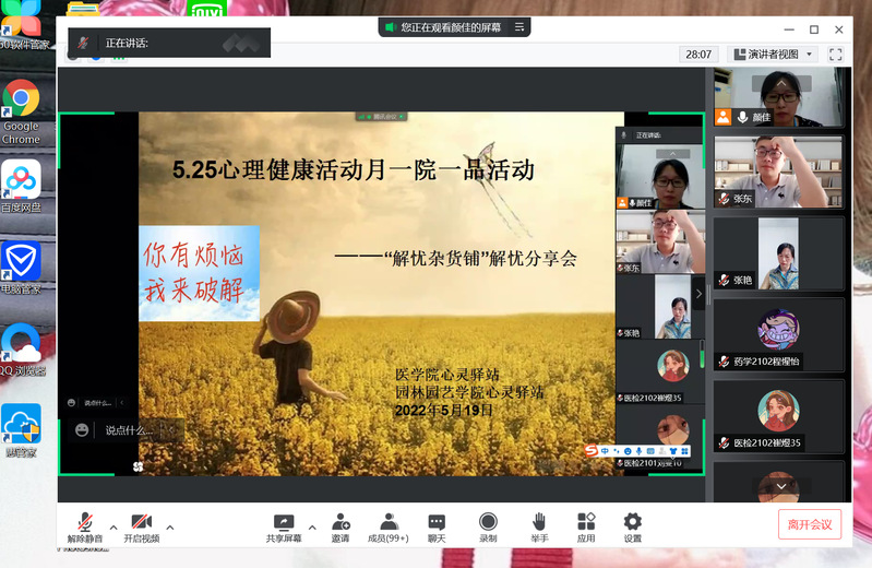 为积极举办betway必威中文版5.25心理健康宣传月活动,坚持育心与育德相统一,更好地适应和满足学生心理健康教育服务需求,医学院和园林园艺学院心灵驿站于2022年5月19日中午12点30分在园林园艺学院实训中心开展了一院一品心理健康教育活动之解忧杂货铺“解忧”分享会,分享会采用线上腾讯会议和线下相结合的形式,特邀betway必威中文版 心理发展与咨询中心教师,国家二级专业心理咨询师张东老师,医学院专任教师、国家二级专业心理咨询师袁红网老师,医学院教学秘书季琰老师,医学院优秀毕业生、扬大附属医院第四批援鄂抗疫护师孙颖同学,国家奖学金获得者休农2001班苏晟阳和护理1903班姬定康为同学们进行“解忧”分享。