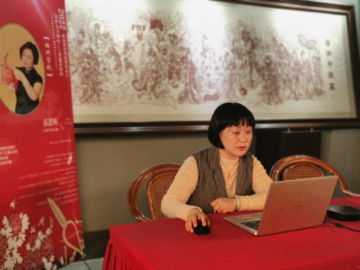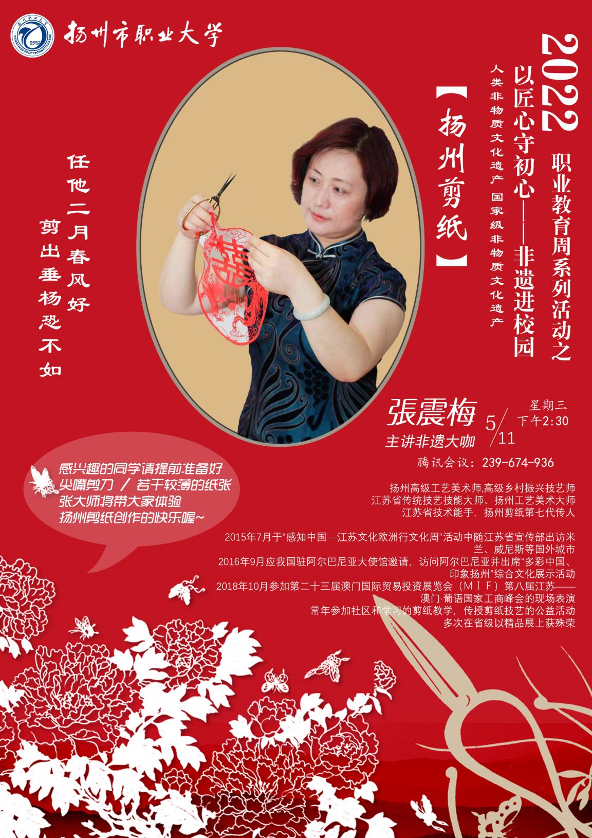 讲座主讲人张震梅,女,1976年出生,扬州人,高级工艺美术师,高级乡村振兴技艺师,江苏省传统技艺技能大师,江苏省技术能手,扬州工艺美术大师,扬州剪纸第七代传人。其剪纸作品多次在省级以精品展上获奖,推动了扬州剪纸的传承与发展。