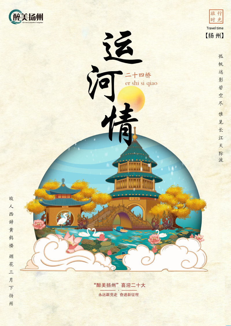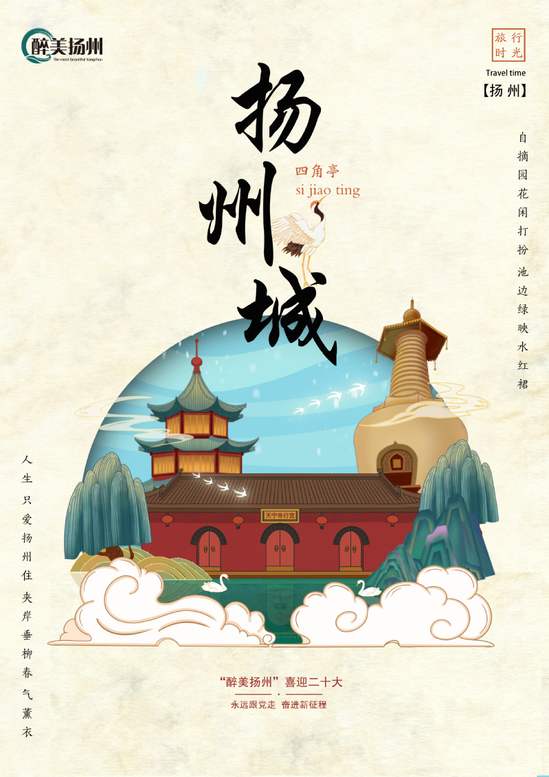 扬州是一个很美的城市,景色宜人,有诸多具有文化历史的建筑,为了宣传扬州的风景和喜迎二十大的召开,我围绕扬州的建筑风景、文化特点,用国风插画的表现形式来对扬州建筑景点进行绘画和设计,制作了两幅海报。希望更多的人能去到扬州,欣赏一下扬州的风采,希望我们的祖国越来越繁荣,越来越强大。 |