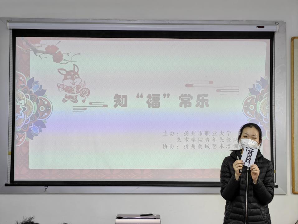为响应江苏省“全民阅读送春风”行动,鼓励引导大学生更好地了解国情、感知社会、热爱家乡、服务群众,投身企业实践、公益服务、社区服务、文化宣传,艺术学院青年先锋队结合自身专业特色组建“阅美社”小分队,深入社区,开展了《知“福”常乐》、《故乡灯节》灯主题活动。