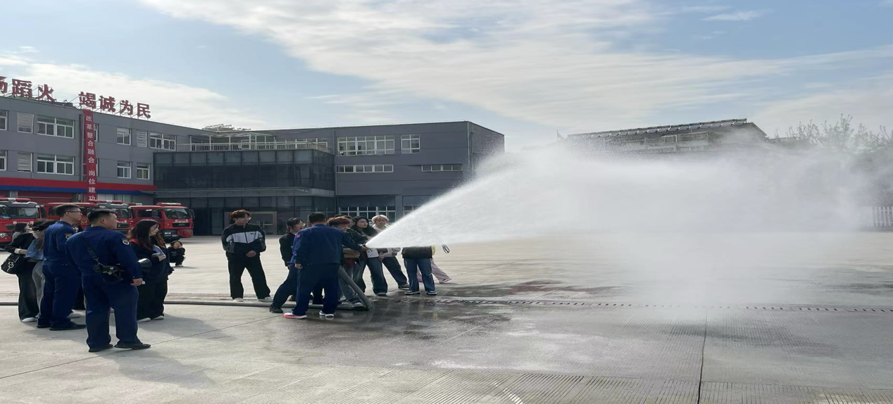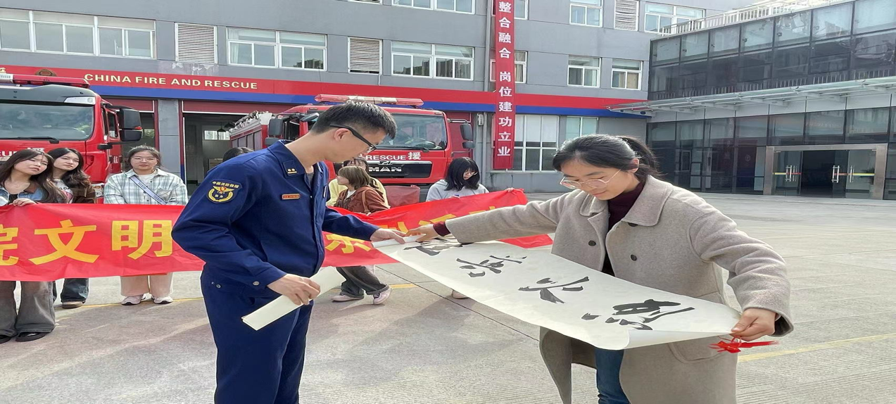 消防员们还带领学生学习体验了消防喷水枪的使用,让学生们亲身感受救援救火的使命感与责任心。最后,艺术学院团委书记张玉康给新盛街道消防队员送去了学院师生的书写作品,相互赠予,情谊加深。