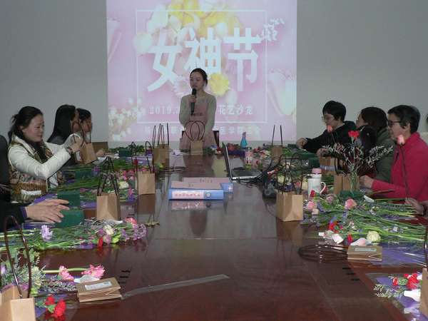 花艺沙龙于3月8日下午在医学院A314大会议室举行,本次活动共吸引了近50位全校女教师参加。医学院党总支李霖书记致本次活动贺词,她代表学校工会王桂山主席向在座的女同胞表示节日的祝贺,并向大力支持本次活动的校工会表示衷心地感谢。本次活动邀请有着近十年丰富经验的花艺师,现场介绍鲜花常识,从选择与购买、鲜花的保养与摆放、女性收到鲜花回家后该如何养护、如何延长花期、插花艺术等一一进行讲解,让人在四溢的生机与浪漫中,在悠然的花香浸染间,享受闲适与自然。每位女教师对插花艺术兴趣极高,纷纷与花艺师交流互动,请教一些插花方面的专业知识,跟着老师的节奏,一步一步创作自己的插花作品。最后由花艺师对老师的插花作品进行评比,分别评选出一二三等奖。本次花艺活动较好地缓解了医学院女教师们的工作压力,丰富了大家的精神文化生活。大家在满满的成就感中愉快地度过了自己的节日。
