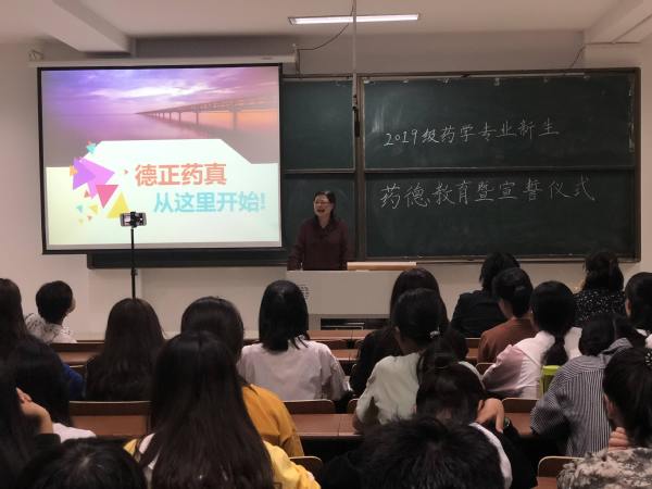 药学专业邀请国药控股扬州有限公司质量负责人朱雪梅作《德正药真从这里开始》的报告,她着重对新生强化药学职业道德规范,要求同学们培养自己吃苦耐劳、科学严谨的态度,仁爱爱人,文明服务,济世为怀,清廉正派。