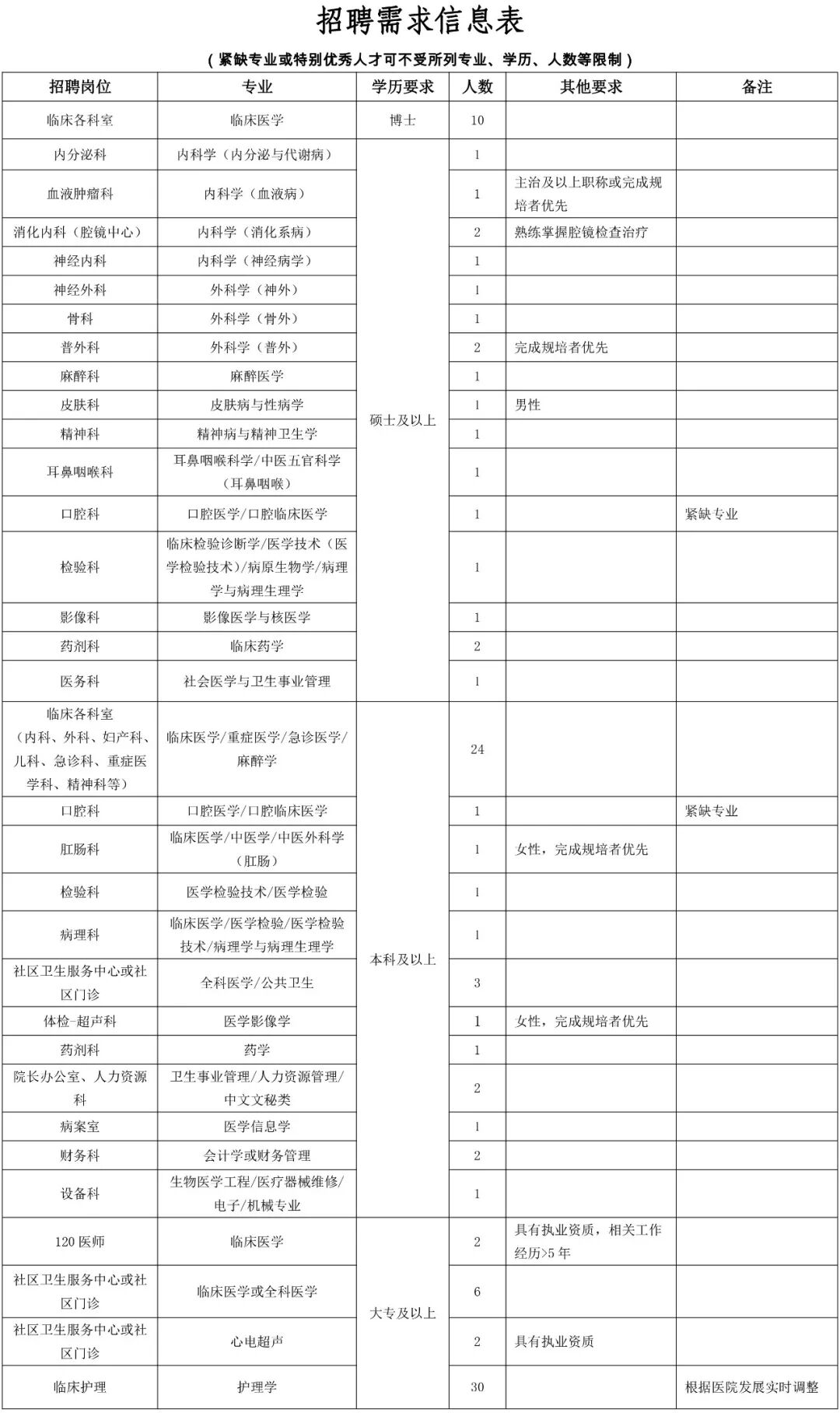 7.有三级医院临床一线工作经历3年及以上或应聘紧缺专业人员,年龄及学历要求可适当放宽。