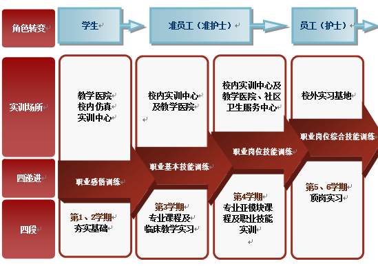 护理专业主动适应医疗卫生事业的发展需要,秉承“人本关怀,全程照护”的服务理念,以职业能力和专业能力培养为核心,创新构建了“行业主导、院(医院)校融通、教学做一体”的“四段四递进”工学结合的人才培养模式(见图-1),“四段”即时间分四段,“四递进”专业岗位技能四轮递进训练。第一轮,第一、第二学期为夯实基础阶段,主要开设公共文化课和专业基础课,学习基础知识,主要利用校内实训基地平台,通过产学结合,训练专业基本技能,安排学生每周3-4次进入校内外实践基地(主要为教学医院),多层次多视角观察服务对象和工作环境,形成感性认识、体验服务需求,感受职业氛围,激发求知欲;第二轮,第三学期、第四学期前2/3的专业课程及临床教学实习,主要利用校内实训基地平台、教学医院和教学医院教学平台,通过工学结合,训练职业基本技能;第三轮,第四学期后1/3为专业技能训练阶段,主要利用校内实训基地平台、教学医院、社区卫生服务中心和教学医院教学平台,通过工学结合,训练职业岗位技能;第四轮,第五学期、第六学期利用校外毕业实训基地,通过顶岗实习,实现岗位技能实训与工作过程的对接,训练职业岗位综合技能。教学在学校和医院交替进行,使学校教育与临床实际紧密结合,将学生培养成具有良好的职业道德、较强的护理知识和技术应用能力的高素质技术技能人才。