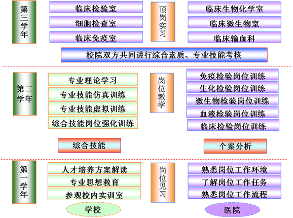 践行以“医教结合、校院共育”为主要内容的校企合作、工学结合型人才培养模式(如下图),第一学年:职业感知:通过人才培养方案解读、专业思想教育、参观校内实训基地、认识实习、基层社会实践、社会调查、职业规划、历届优秀毕业生事迹报告等增加学生职业感知和社会责任感,了解岗位工作任务,熟悉岗位工作流程;第二学年:仿真实训,岗位教学:强化岗位必需的核心技能训练,提高竞争力;第三学年:职业综合技能培养:通过医院检验科或第三方检验中心各科室的顶岗实习、职业技能培训和体检中心、CDC、基层社区、乡镇医院进行专业拓展模块实习,提高职业综合能力,多证上岗、多元化就业。