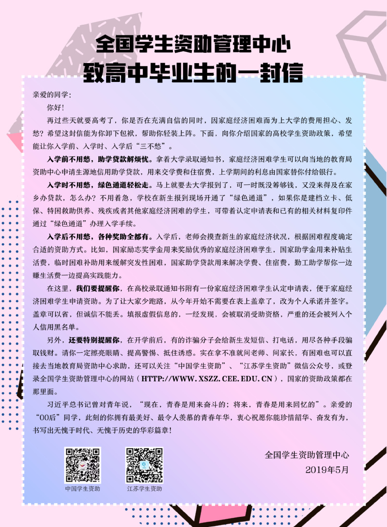 全国学生资助管理中心致高中毕业生的一封信