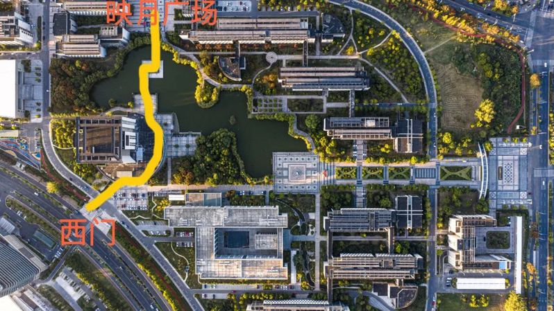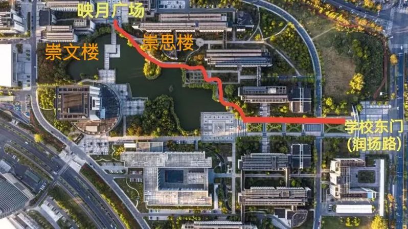 如果考场在崇思楼,向西走一小段就能看到映月湖的湖滨小路,之后沿着小路向北走即可到达映月学术报告厅;如果考场在崇文楼,向东穿过映月广场即可到达。
