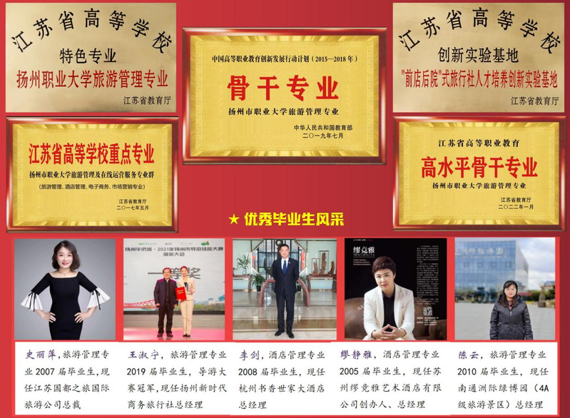 旅游管理专业是国家级骨干专业、教育部旅游类院校示范遴选专业、江苏省高职院校高水平骨干专业、江苏省高等学校特色专业、江苏省重点专业;酒店管理与数字化运营专业是江苏省重点专业、校级特色专业、教改试点专业。旅游类专业经过十余年建设与发展,已成为省内外有较高知名度的强势专业,并形成鲜明的办学特色:“高”“职”并重的人才培养目标特色,“教学做创合一”人才培养模式特色、“现在进行时”的双师团队特色,“前店后院”工学结合实训体系特色,“零距离,高质量”就业特色。学生多次参加全国、省旅游技能大赛,获得一等奖。江泽民同志曾接见旅游学院的实习生并合影留念。