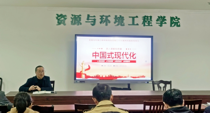 3月15日下午,资源与环境工程学院党总支开展党的二十大精神专题系列学习,党总支副书记周义彬以“深入理解和把握中国式现代化”为主题做了报告,学院全体教职工参加学习。