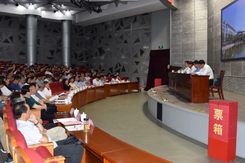 当前位置:首页党建工作5月15日上午,我校在映月学术报告厅召开校领导班子换届考察动员部署大会。省委组织部考察组组长、南京工业大学原党委书记王德明、扬州市委组织部常务副部长徐龙及考察组全体成员出席会议。校党政领导班子成员,中层干部,校级老领导,县(区)级以上党代表、人大代表、政协委员,民主党派负责人及具有高级职称的专业技术人员代表参加了大会。党委书记周胜主持会议。