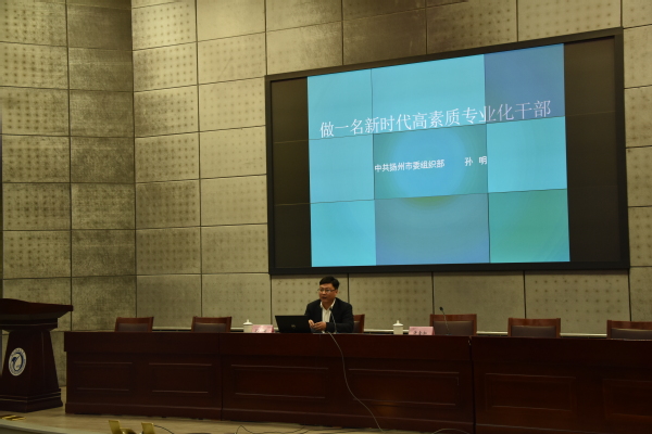 当前位置:首页干部工作为深入学习贯彻落实党的十九大精神,进一步推进我校“党员干部素质能力提升工程”,提高我校广大干部的管理水平和工作能力,10月25日,学校邀请扬州市委组织部组织处处长孙明在映月学术报告厅作题为《做一名新时代高素质专业化干部》的专题讲座。校领导周胜、王如平、陈亚鸿、刘宏,全体中层干部、部分内设机构负责人近300人参加。党委副书记、副校长许金如主持讲座。