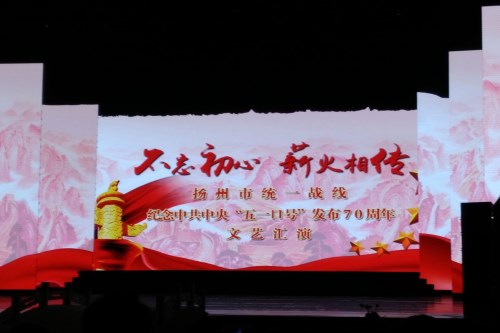 当前位置:首页统战工作4月26日下午,由市委统战工作领导小组主办的扬州市统一战线纪念“五一口号”发布70周年文艺汇演在扬州大剧院举行。演出分为“风雨话当年”、“统战谱华章”、“统战走进新时代”三个篇章。我校各民主党派基层组织联合选送的小合唱《今天是你的生日》入选第一篇章,汪庆生、姚星桃、汤军、严双林、杨洁、张疆涌等我校民主党派成员的精彩表演,获得观众好评。