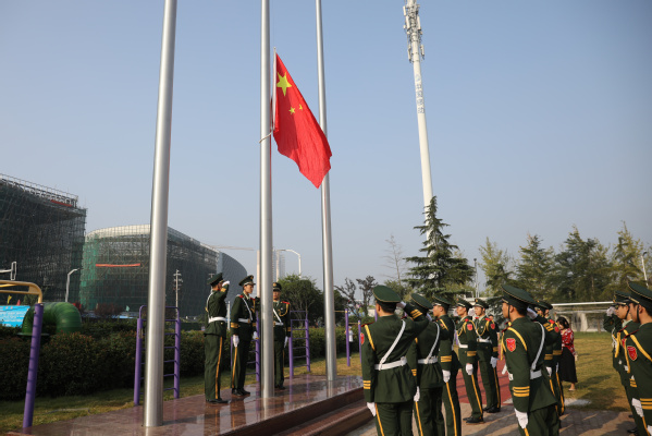 上午八点整,在《歌唱祖国》乐曲声中,学校国旗护卫队迈着整齐的步伐护卫五星红旗走向旗杆。随着庄严的国歌声响起,全场近万名师生、员工面向国旗行注目礼,高唱国歌。