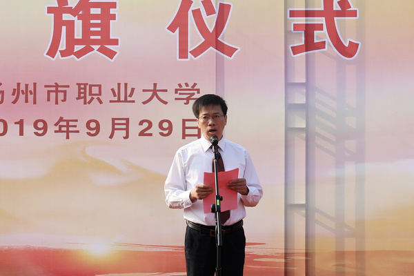周胜指出,今天,我们站在鲜艳的五星红旗下,热烈庆祝中华人民共和国成立70周年,共同抒怀祖国的沧桑巨变与伟大成就,共同祝福祖国更加繁荣昌盛、人民更加幸福安康。他强调,70年来,党引领人民绘就了一幅波澜壮阔、气势恢宏的历史画卷,取得了令世界为之惊叹的辉煌成就。他要求,学校要在厚植高等职业教育沃土的耕耘中,始终与国家经济社会发展同呼吸共命运,为强富美高新江苏建设和扬州“三个名城”建设做出应有的贡献;要不忘百年树人之初心,牢记教育强国之使命,推进学校事业高质量发展。他希望,广大同学要不忘求知若渴之初心,牢记实现中国梦之使命,把以祖国为荣换化为爱国爱民之情、忧国忧民之心,勤于学习、敏于求知,增强本领、砥砺技能,用奉献祖国、奉献人民的实际行动,让爱国主义的伟大旗帜始终在心中高高飘扬。
